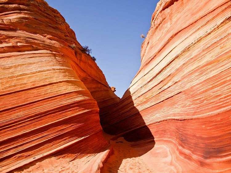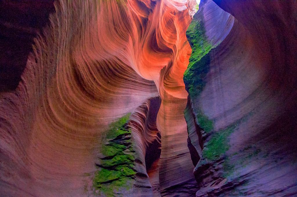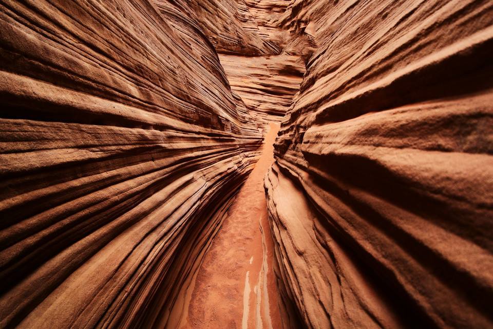 穿越在狭窄的沟壑中,岩壁被水和风冲蚀出一条条清晰顺滑的纹路,犹如波浪从你身边划过,似行云流水……